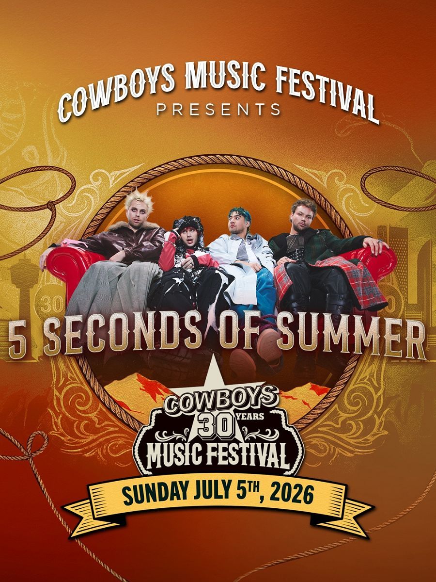 🎉 Welcome to Cowboys Music Festival: 5 Seconds Of Summer, where the impossible becomes possible and dreams take flight! 🏛️ Join us at Cowboys Park in the heart of Calgary, AB for an event that will redefine your expectations. 📅 On July 4th, 2026 at 05:00 PM, witness the transformation of space and time into something truly magical. ✨ It's a curated experience combining the best of innovation, entertainment, and community spirit, creating moments that will be remembered for years to come. Whether you're a first-time visitor or a seasoned enthusiast, prepare to be amazed. 🎊 Book now to ensure your place in this unforgettable experience!http://maps.seatics.com/GeneralAdmissionEvent_2021-07-08_1018_11272024_094642_SVGC_tn.png
