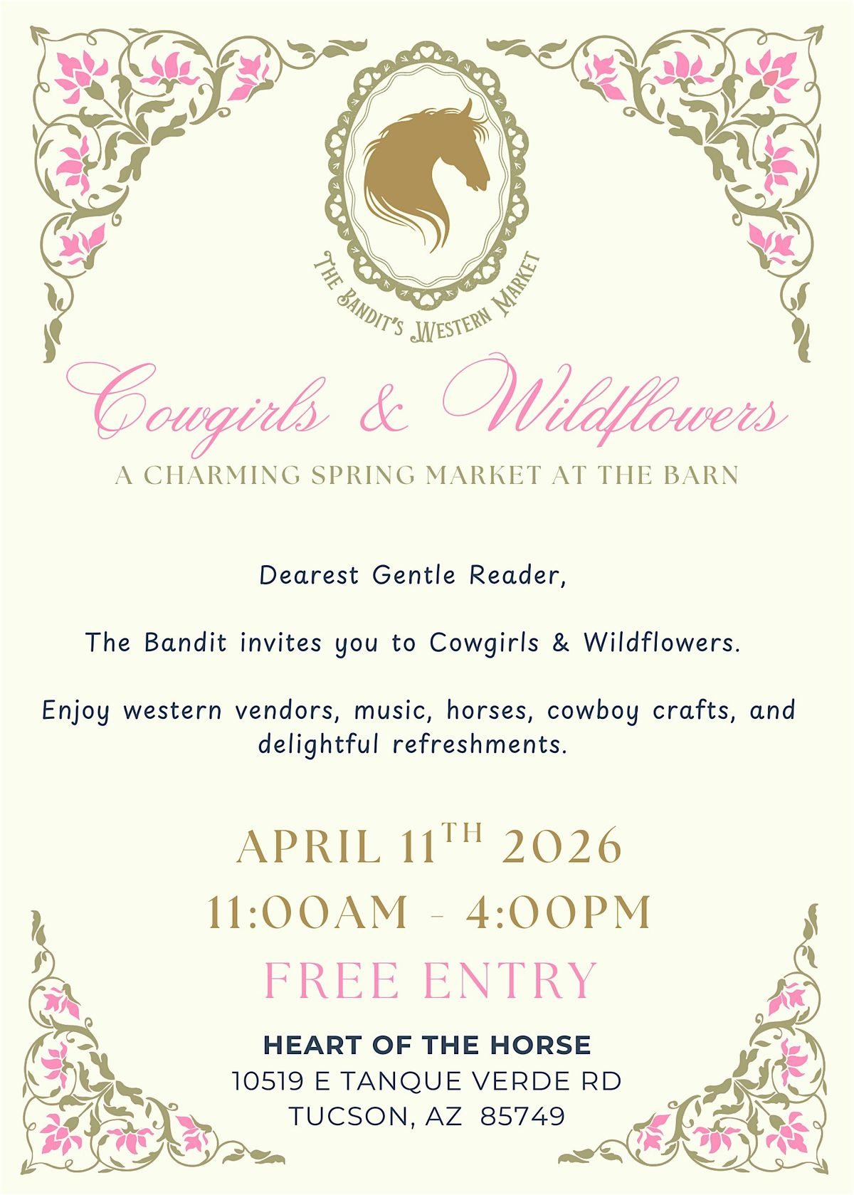 You are cordially invited to Cowgirls & Wildflowers, a delightful spring market hosted by The Bandit’s Western Market at the beautiful Heart of the Horse equine facility in Tucson.