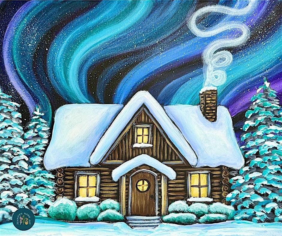 On Sunday, January 25th, from 3:00–5:30 PM, you’ll be guided step-by-step in painting this peaceful winter cabin glowing beneath swirling northern lights.