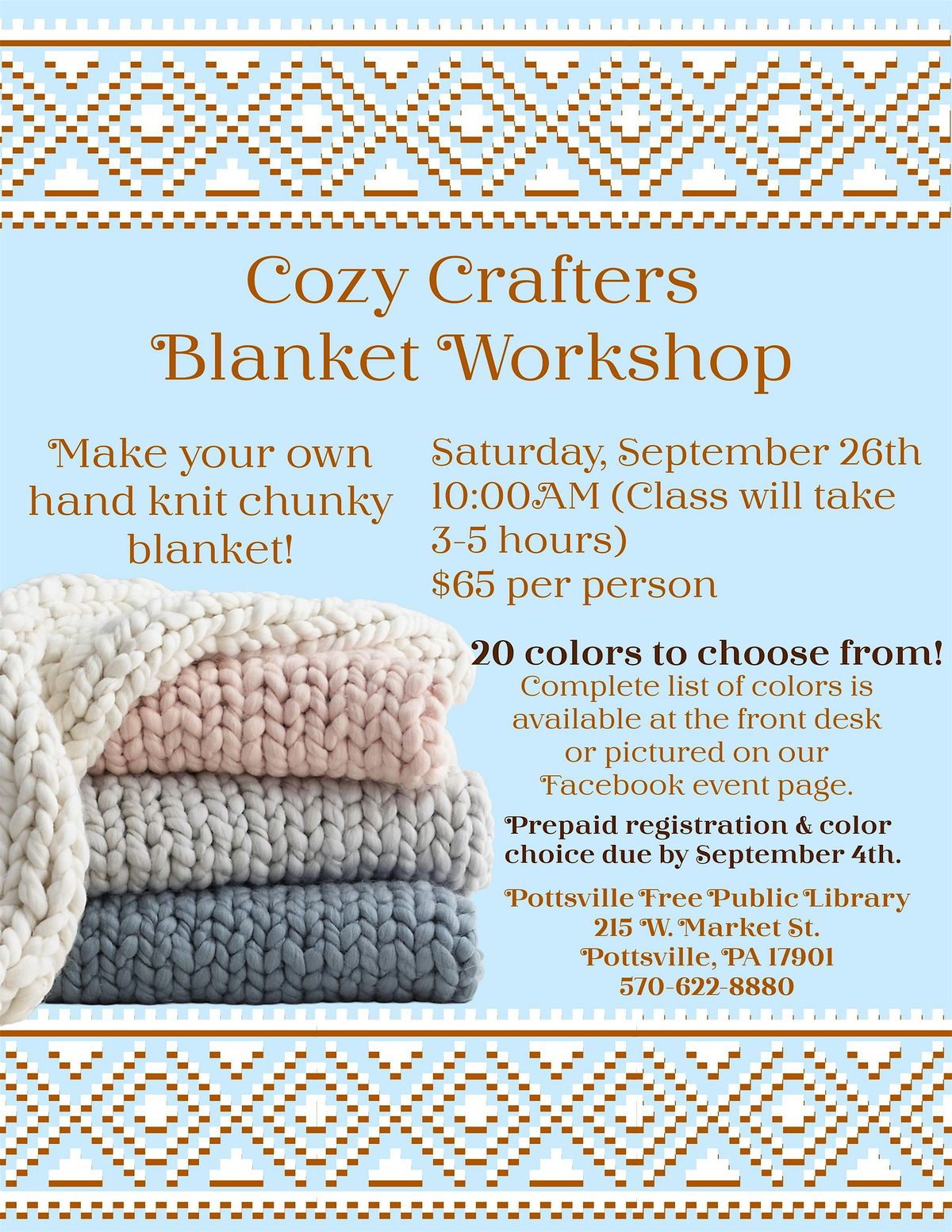 Get ready for fall with your own hand knit chunky blanket! We will be making a throw sized blanket from start to finish--full instruction will be provided (with help along the way, if needed!). Class size is limited to 10, so book early! Additional classes may be added if there is demand. Class will run 3 to 5 hours, so please bring snacks/refreshments for breaks!