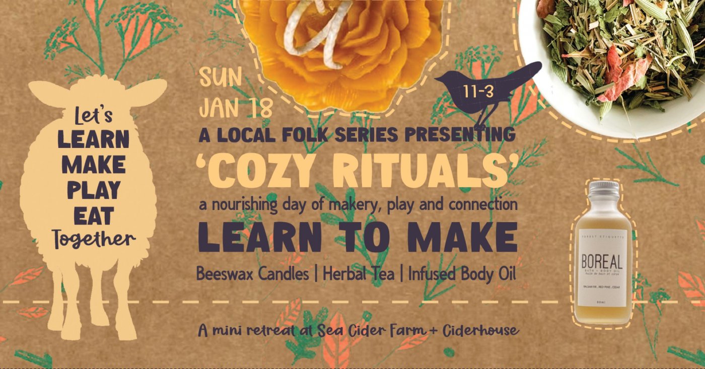Join us for a Nourishing Day of Makery, Play & Connection ~ at our "Cozy Rituals" Mini Retreat, Sunday, JAN 18th, at the beautiful Sea Cider Farm + Ciderhouse. The Cozy Ritual workshop series invites you to slow down, work with natural materials, and build a deeper, everyday relationship with the place you call home through touch, taste, smell, and the creation of simple items, thoughtfully crafted using your own hands and the abundance of our wild landscapes Learn to make & take home 3 Handmade Products ~ gather with wonderful local folk, in a beautiful and inspired location, with: