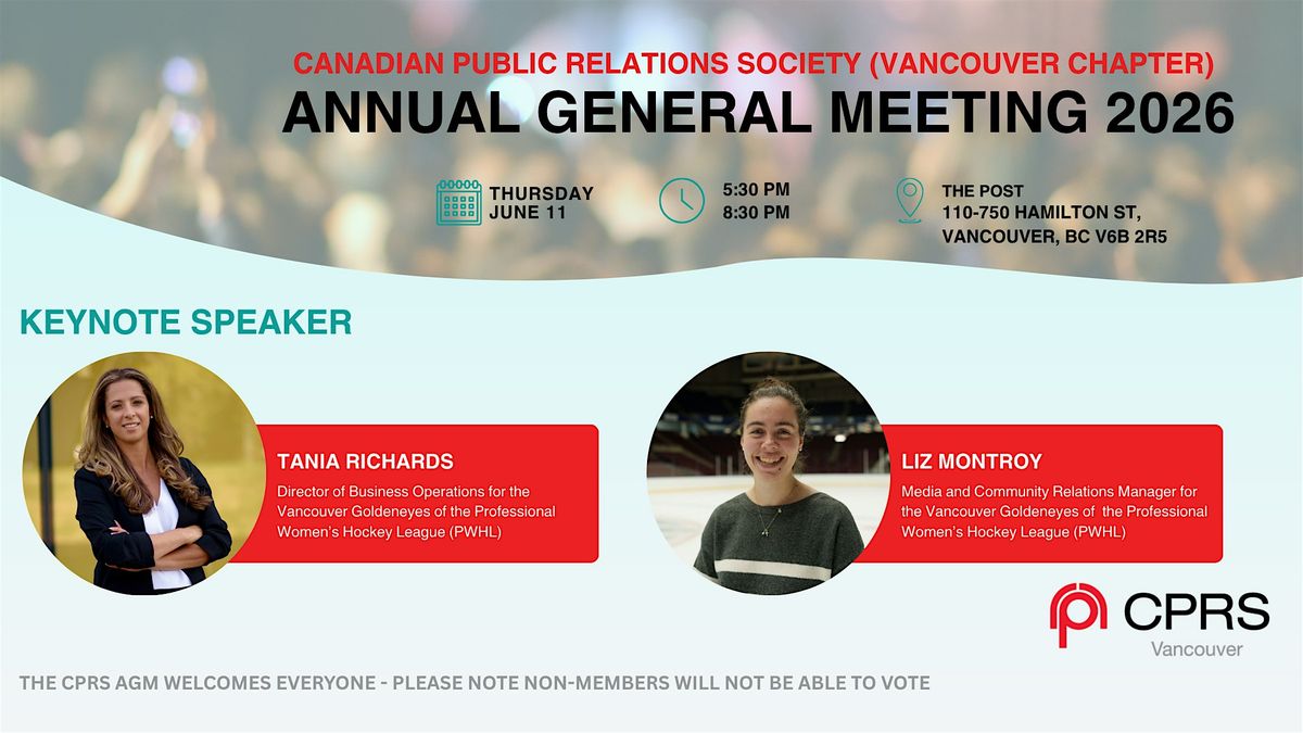 Join the Canadian Public Relations Society of Vancouver (CPRS) at our Annual General Meeting and keynote presentation by by Tania Richards, Director of Business Operations, and Liz Montroy, Media and Community Relations Manager for the Vancouver Goldeneyes of the Professional Women’s Hockey League (PWHL)