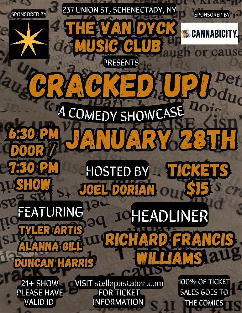 Presented in The Van Dyck Music Club located in The Historic Stockade District of Schenectady NY, "Cracked Up!" is a brand new stand-up comedy showcase put on by local, talented comics from the 518! Hosted by Joel Dorian, "Cracked Up!" features Tyler Artis, Alanna Gill, and Duncan Harris, with the esteemed Richard Francis Williams closing out as our show headliner!
