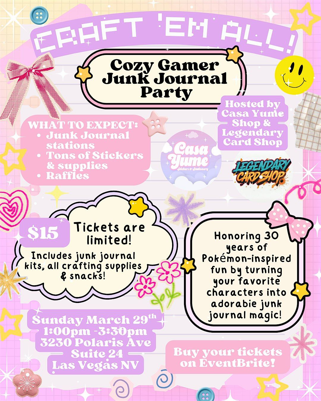 Join the Casa Yume Shop & Legendary Card Shop for an afternoon of crafting, stickers, and nostalgia! Bring your favorite childhood gaming memories to life as we create cute junk journal spreads inspired by the classic Pokemon. Celebrate 30 years of your favorite characters with stickers, crafts and good times!