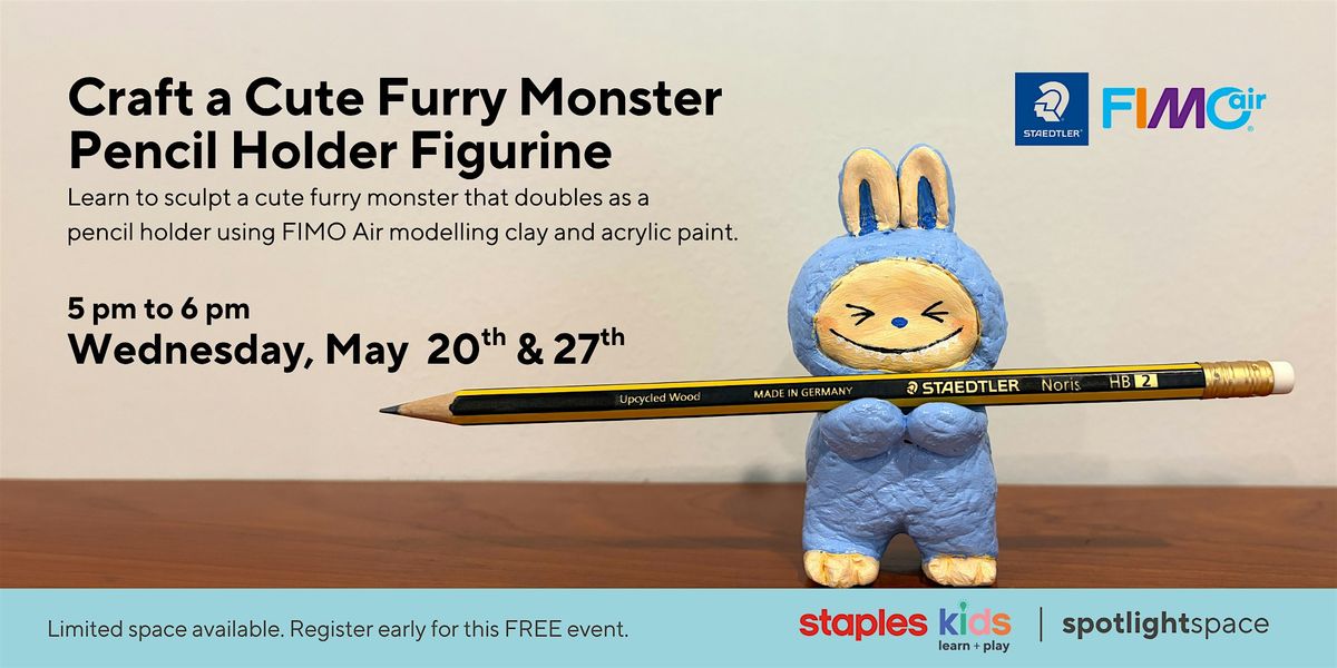 You can join us virtually or in person at particapting Staples locations. All in person attendees are required to register and attend both sessions. All in person attendees will get to create their own Furry Monster pencil Holder figure and keep the supplies from the session for future useage.