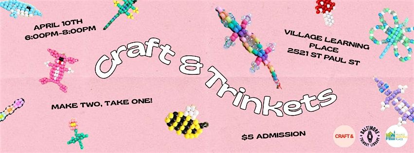 Donations to the Baltimore Trinket Library will also be accepted and collected during this event. None of the event proceeds are collected by the Baltimore Trinket Library- all event costs collected by Craft & go toward cost of supplies for the activity.