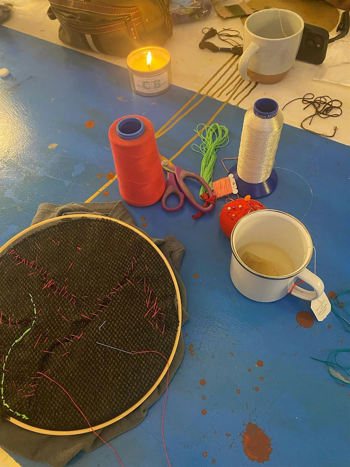 Bring your own project to work independently alongside other creatives. We provide some basic hand sewing supplies for communal use. The vibe of this night is "chill making". We project slow fashion films on the wall in a somewhat low-lit calming atmospshere. If you need up close light- we suggest bringing a small clamp flashlight for your project. We provide free hot tea. (this is not a class)