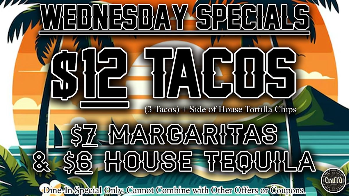 $12 for 3 Tacos w/ side of House Tortilla Chips $7 Margaritas