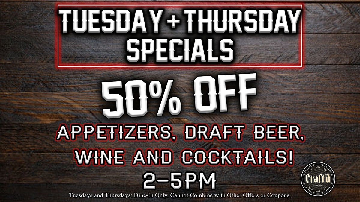 Tuesday & Thursday 2–5pm: 50% Appetizers, 50% Off Draft Beer, Wine & Cocktails. *Dine-In only. Cannot combine with other offers or coupons.