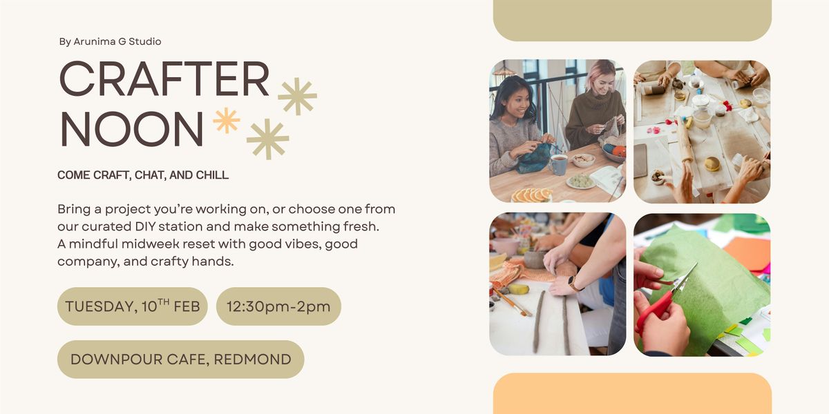 Crafternoon is a monthly creative meetup for adults—a calm, self-guided space to unwind, make something with your hands, and connect with like-minded makers. Bring a project you’re already working on, or create something new using our curated supplies station, where you can mix and match materials and let your imagination lead. No pressure, no perfection—just a mindful pause, good energy, and a little creative company.