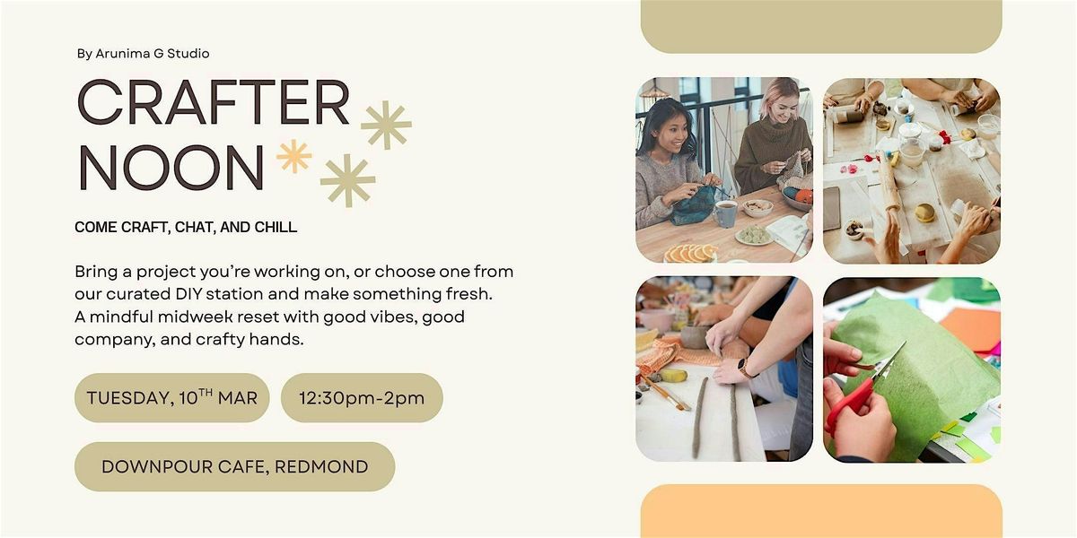 Crafternoon is a monthly creative meetup for adults—a calm, self-guided space to unwind, make something with your hands, and connect with like-minded makers. Bring a project you’re already working on, or create something new using our curated supplies station, where you can mix and match materials and let your imagination lead. No pressure, no perfection—just a mindful pause, good energy, and a little creative company.