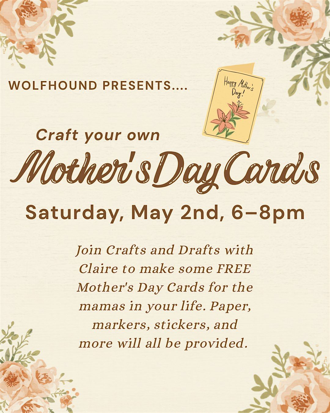 Join Crafts and Drafts with Claire at Wolfhound on Saturday, May 2nd from 6-8pm to create your own FREE mother's day cards. Paper, markers, stickers and more will all my provided. Option to leave your creations and they will be sent out for you!