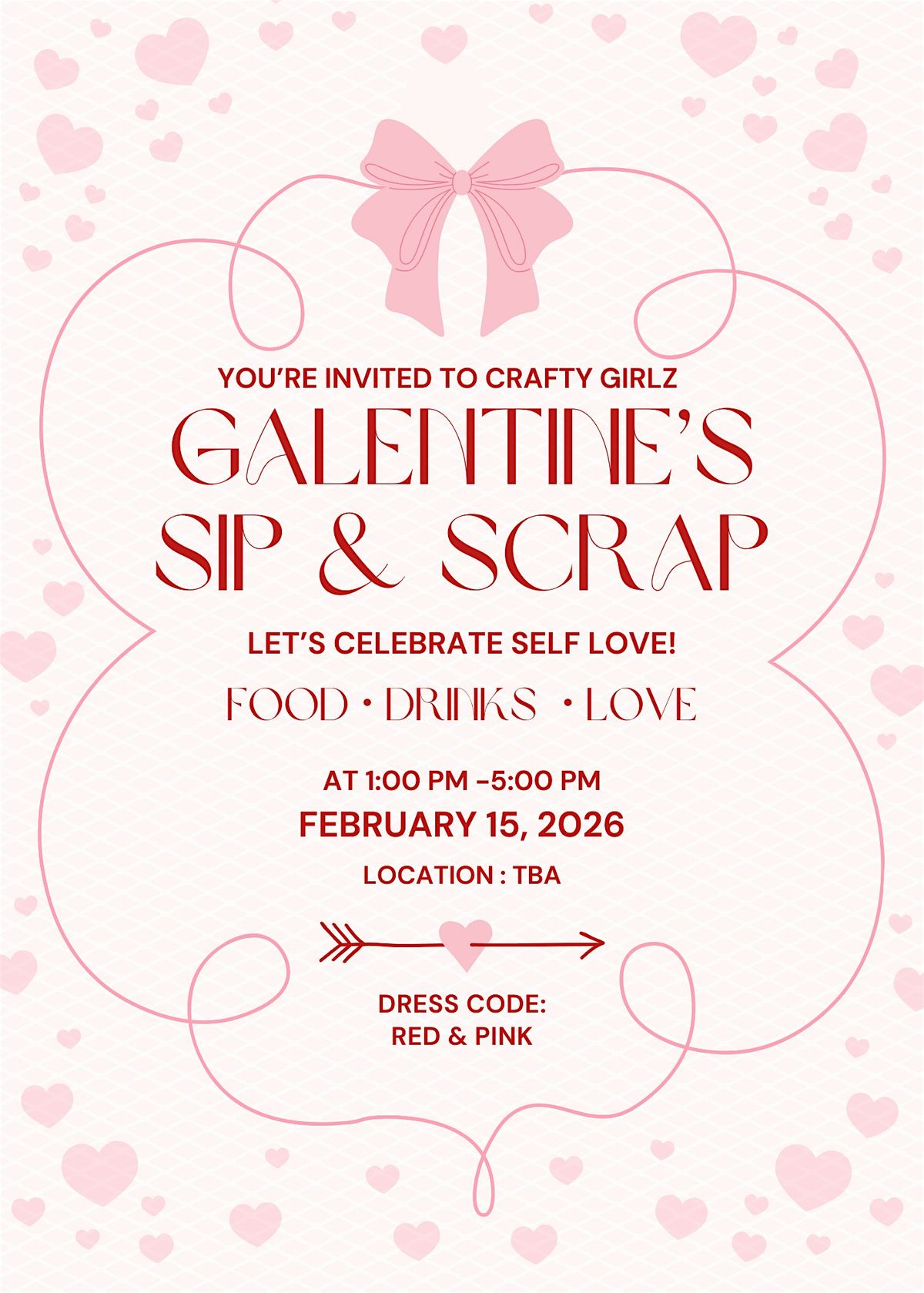 Welcome to the Crafty Girlz Galentines Day Sip and Scrap Workshop! Grab your gal pals and join us for a fun-filled afternoon on February 15, 2026 at 1:00 PM . Let's sip on some drinks, get crafty, and scrapbook together!