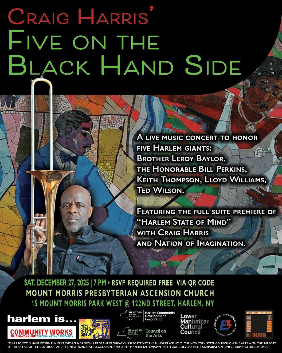We are back with Craig Harris’ Five on the Black Hand, an unforgettable live music event featuring the premiere suite of “Harlem -- A State of Mind” with Harris and his Nation of Imagination.