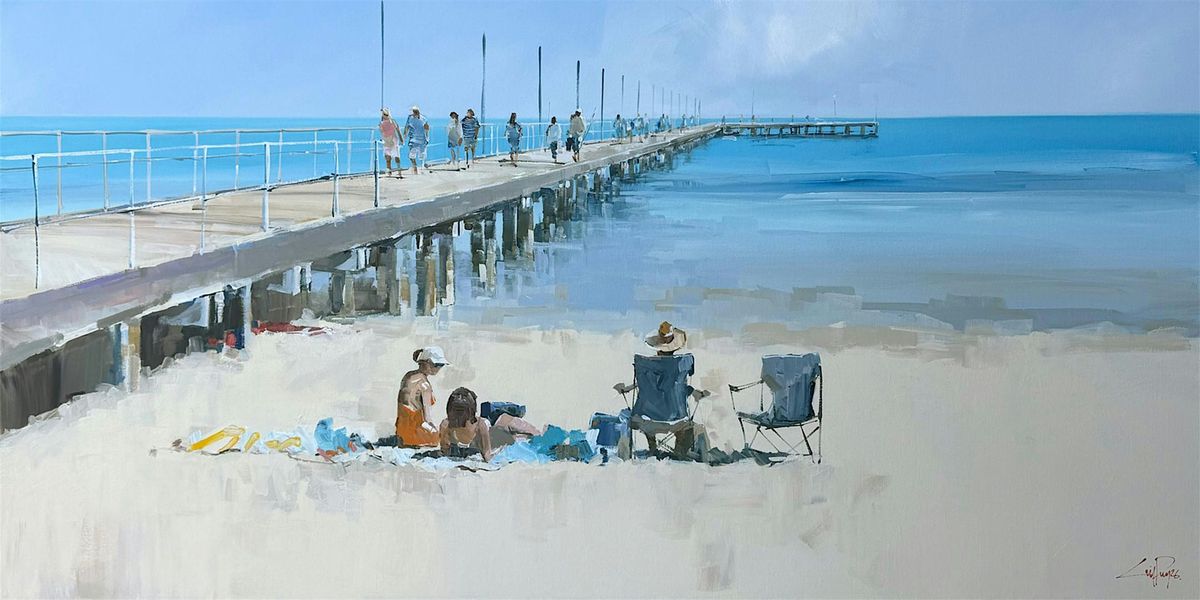 Through Penny’s evocative compositions, the shoreline becomes a meeting point between movement and stillness, solitude and connection. Sunlit piers extend like quiet invitations, guiding us into moments of pause. Figures drift through scenes of leisure—families gathered, friends in conversation, fishing, swimming, each image quietly reflecting the small, familiar moments we return to time and again—the simple rituals that make coastal living feel like home.