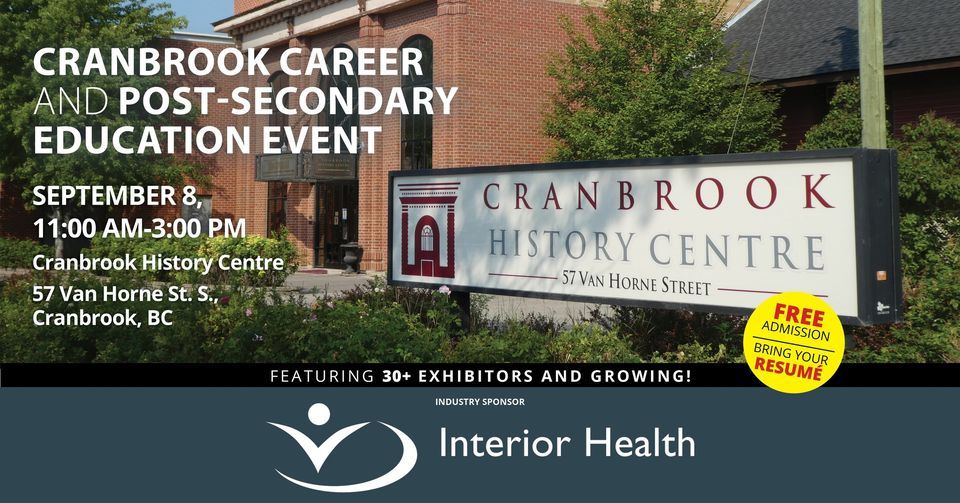 Meet your new employer or enrol in a post-secondary educational institute at the Cranbrook Post-Secondary Education & Career Event!We invite you to join us on September 8th, 2022, at the Cranbrook History Centre, 57 Van Horne St S, Cranbrook, BC. This event will feature employers, education institutions and service providers throughout the BC region that are ready to help you on your career path.