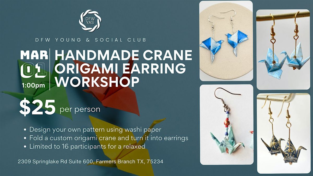 Participants will begin by designing their own pattern using washi paper, then fold that design into a classic origami crane before finishing the piece by attaching it to earring hardware. It is a relaxed and creative class that is perfect for making something special for yourself or crafting a thoughtful handmade gift.