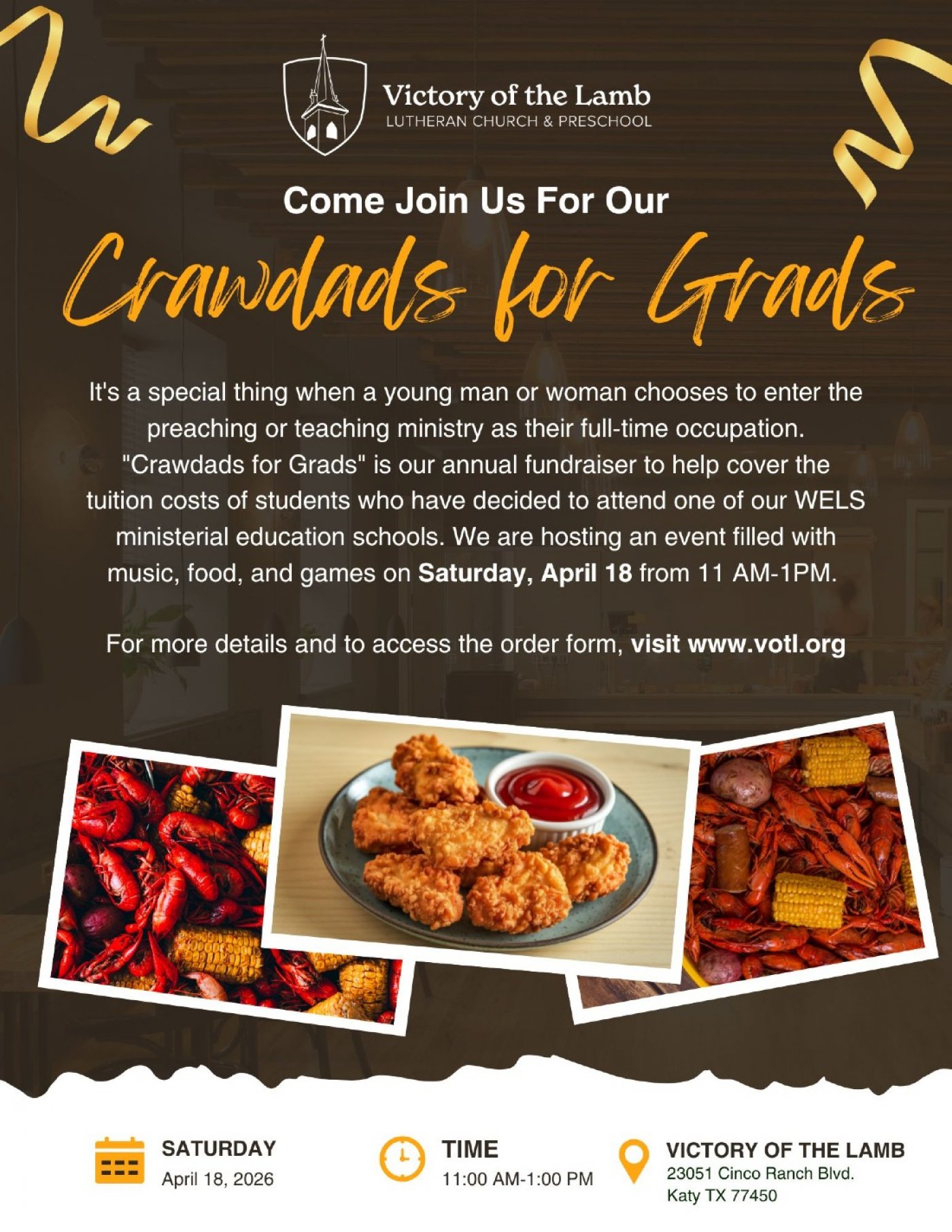It's a special thing when a young man or woman chooses to enter the preaching or teaching ministry as their full-time occupation. "Crawdads for Grads" is our annual fundraiser to help cover the tuition costs of students who have decided to attend one of our WELS ministerial education schools.