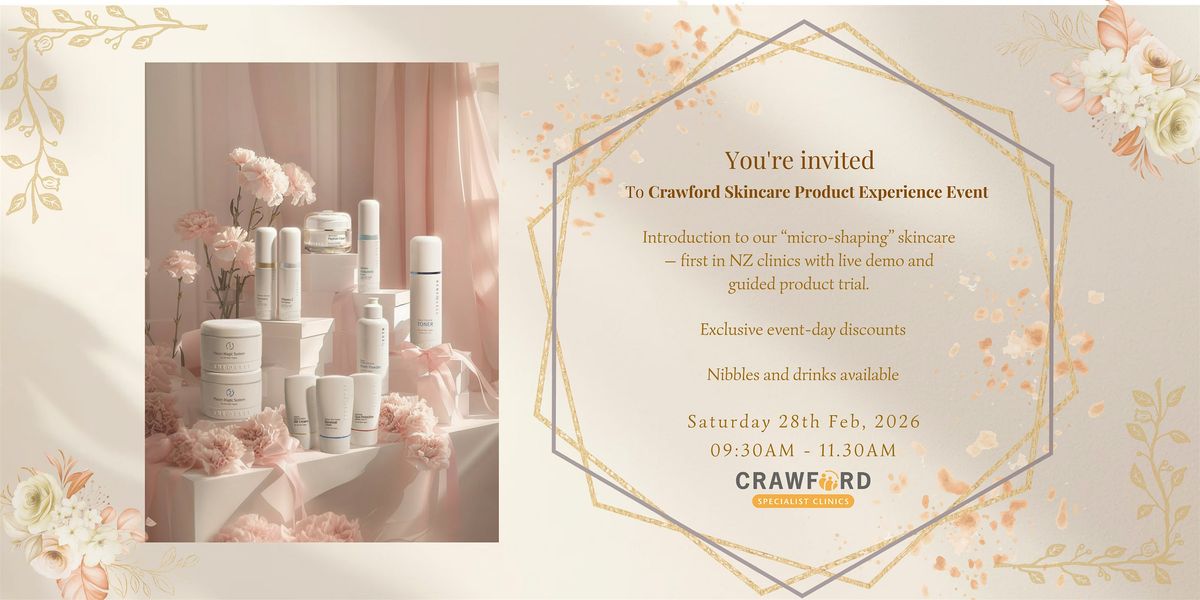 We’re thrilled to invite you to the first-ever Crawford Skincare Product Experience Event — an exclusive showcase of our new medical-grade topical "micro-shaping" skincare range, the first of its kind in New Zealand clinics.