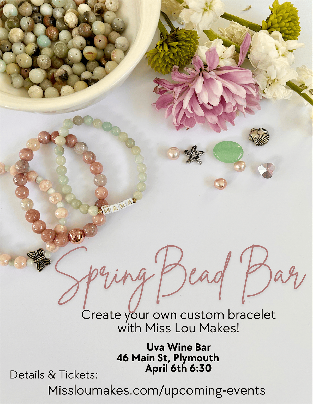 Ready to add a splash of color to your spring style? Join us in person at Uva Wine Bar for a fun and relaxed bracelet-making session. Whether you're a pro or a newbie, you'll love crafting your own unique spring bracelet while enjoying the cozy vibes of the bar! Jess from Miss Lou Makes will bring a variety of gemstone and glass beads for you to create a custom stretch bracelet. Add some accents and charms to make it special. Bring your creativity and a smileālet's make something beautiful together!