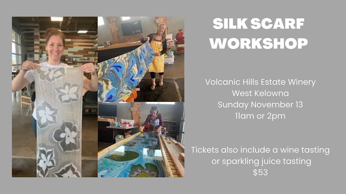 Tickets include all supplies to make your 14 inch by 72 inch silk scarf and a wine tasting,or sparkling juice tasting.