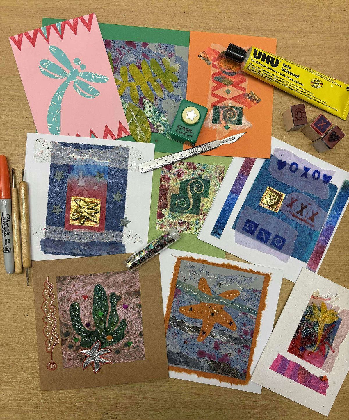 Whether you’re familiar with collage or just looking to try something new, this is the perfect chance to unwind, get into the creative zone, and make something special. No previous experience needed. There will be many materials for you to choose from to put together with examples to look at and some advice about colours and composition. Apart from a wide choice of hand decorated and printed papers, there will be textured paper, embossing tools, hole punches and rubber stamps, as well as items to stick down or cut out.