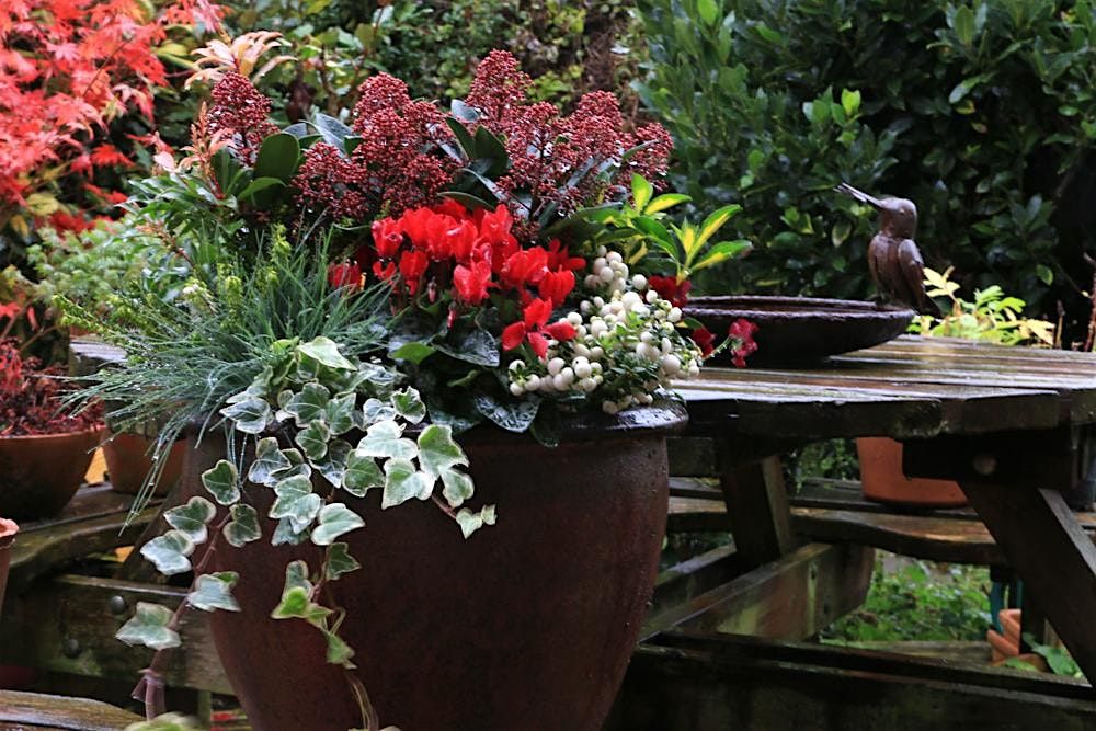 A light hearted and humorous workshop with Jacky about how simple it is to use evergreens, shrubs, ferns, grasses and other hardy plants with seasonal colours and bulbs to create autumn/winter colour in a container or basket.