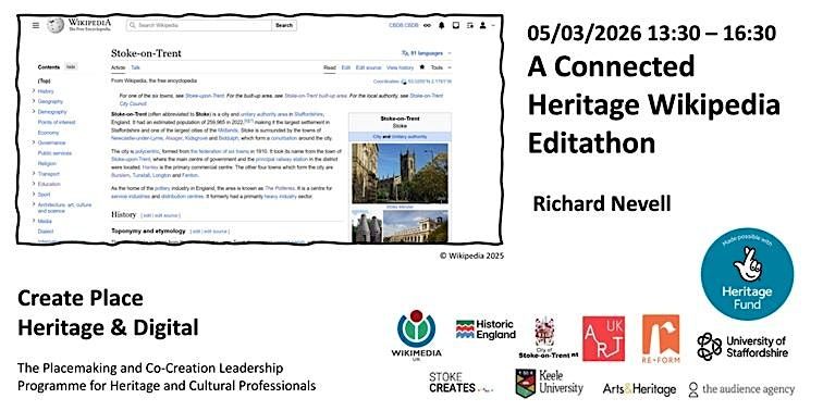 As part of the CREATE PLACE Leadership Programme, we invite you to join our Connected Heritage Wikipedia Editathon—a hands-on workshop designed to empower participants to contribute to the world’s largest free-content online encyclopaedia. Wikipedia is written and maintained by a global community of volunteers, and this session will introduce you to the essentials of editing, why it matters, and how you can get started.