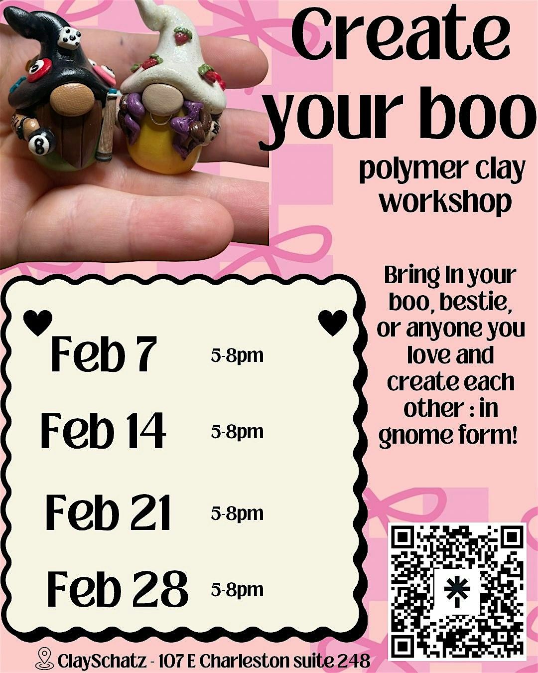 learn the basics of polymer clay sculpting and make your own personalized gnome figurine of your partner/friend/parent/child or anyone you love! Workshop is set for 3 hours. 30 minutes of this time will be used to "bake" your figurines so you can take them home - same day.- paid Lot parking - free street parking in the area