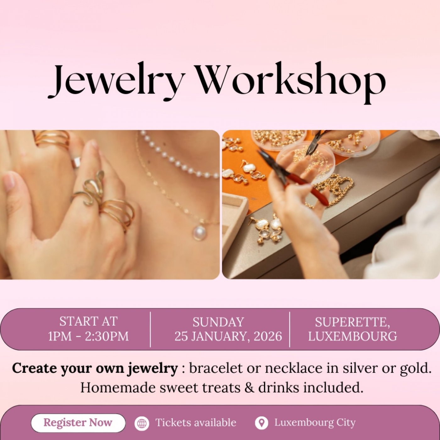 Come vibe with us and create your very own personalized jewelry piece in a warm, inspiring atmosphere. During this workshop, you’ll have the opportunity to design either a bracelet or a necklace, fully customized to your personal style.