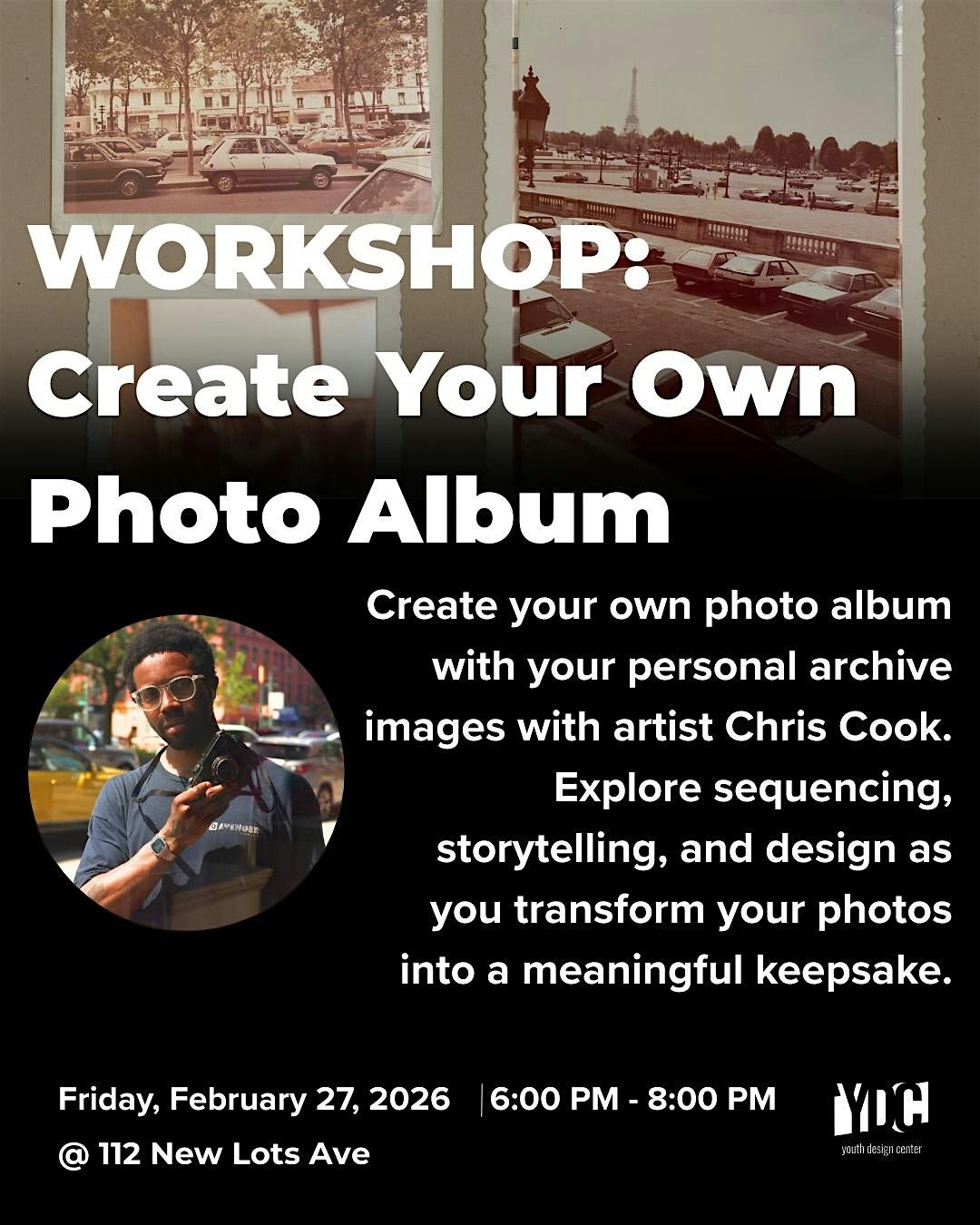 Create your own photo album using images from your personal archive with artist Chris Cook. In this hands-on workshop, you’ll explore sequencing, storytelling, and design as you play with your photos and shape them into a narrative that feels personal and intentional. Experiment with how images speak to one another, reflect on memory and meaning, and leave with a thoughtfully crafted photo album to keep. All photo albums will be provided—just bring your images and curiosity.