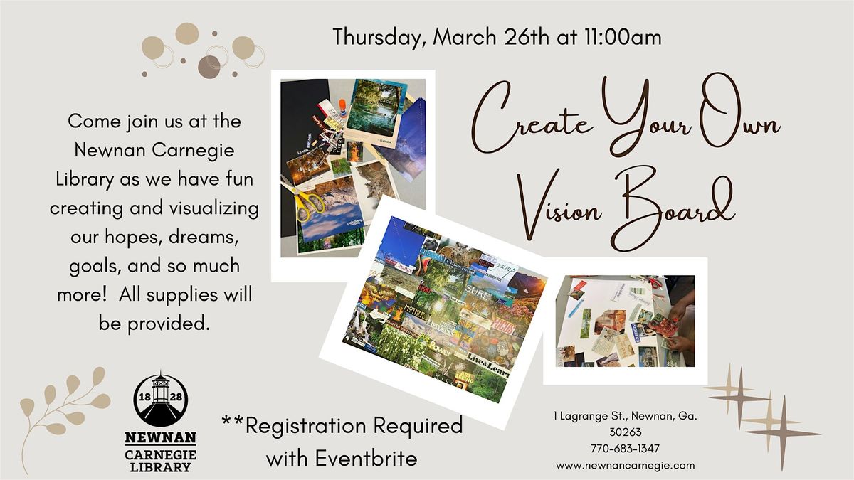 Come join us at the Newnan Carnegie Library as we have fun creating and visualizing our hopes, dreams, goals, and so much more with your very own vision board! All supplies will be provided. **Adults ONLY.