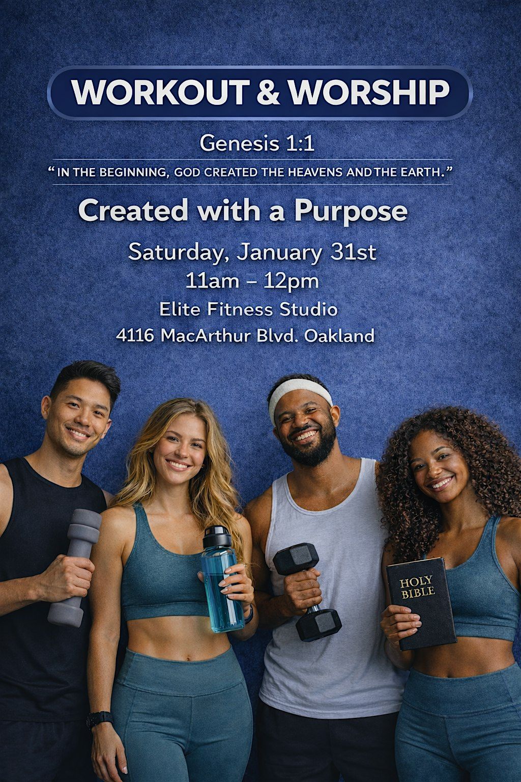 Join us for Created With A Purpose, a unique Workout & Worship experience inspired by Genesis 1:1 “In the beginning God created the heavens and the earth.”