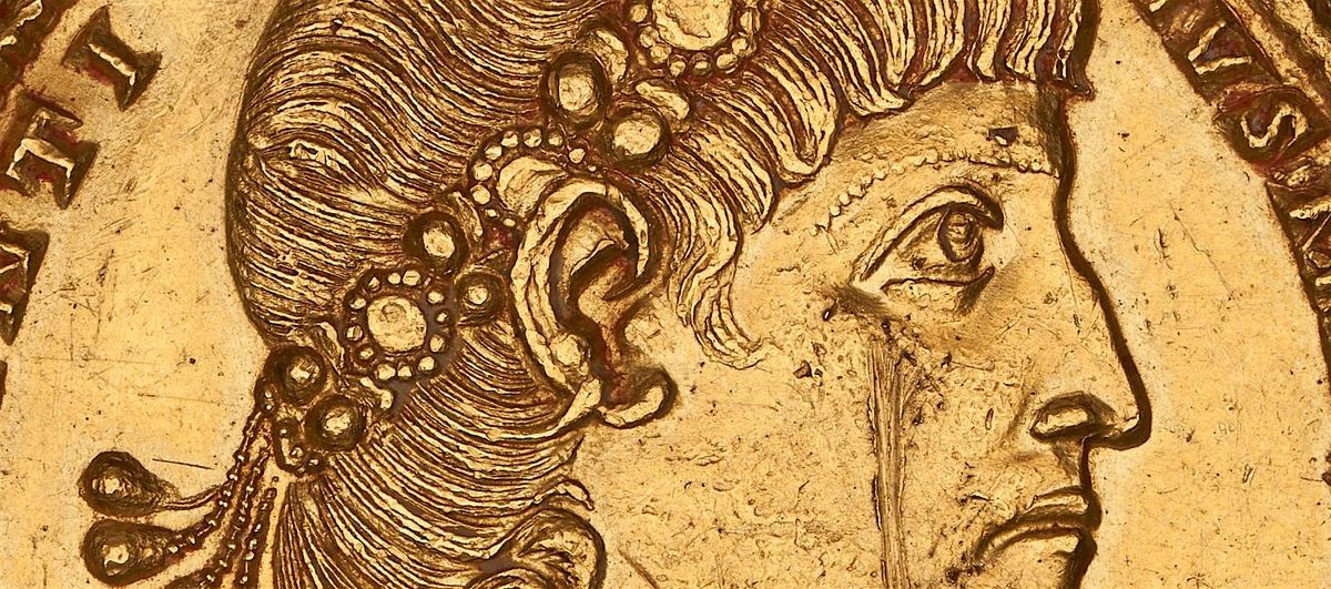 Alt-text: A gold medallion featuring an image of the head and shoulders of a man looking to the right. He wears a jeweled crown and robes fastened at the shoulder with a rectangular broach. Around the edges of the medallion there is text.