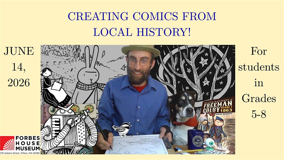 Cartoonist Marek Bennett will demonstrate how he creates his long-running graphic novel series, The Civil War Diary of Freeman Colby, based on primary source texts and artwork. You'll then get a chance to create your own mini-comics and graphic novels based on historical comics, stories, and texts from the Forbes House Museum collections, or your own chosen themes. No experience necessary – everyone can create comics! For students in grades 5-8.