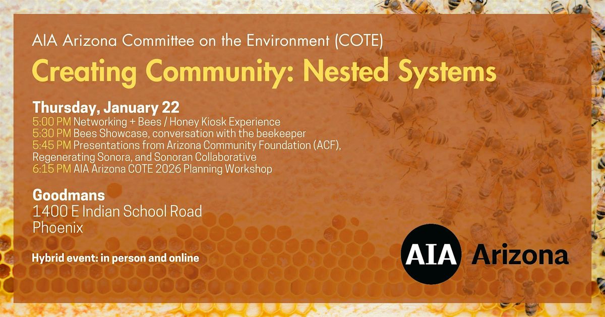 Join AIA Arizona Committee on the Environment (COTE) for an interactive experience exploring collective impact and community collaboration—featuring a guided bee observation and tasting with a local beekeeper for those attending in person, paired with a focused conversation on how architects, designers, and local non-profit organizations can better align their strengths to support meaningful community-building initiatives, and concluding with a facilitated workshop to help shape the framework for an impactful year ahead.
