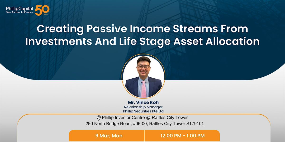 Join us at this seminar on 9 Mar, Mon at 12pm, where Mr Vince Koh, Relationship Manager at Phillip Securities will be sharing on the concept of passive income streams from investments and Asset Allocation based on your life stage.
