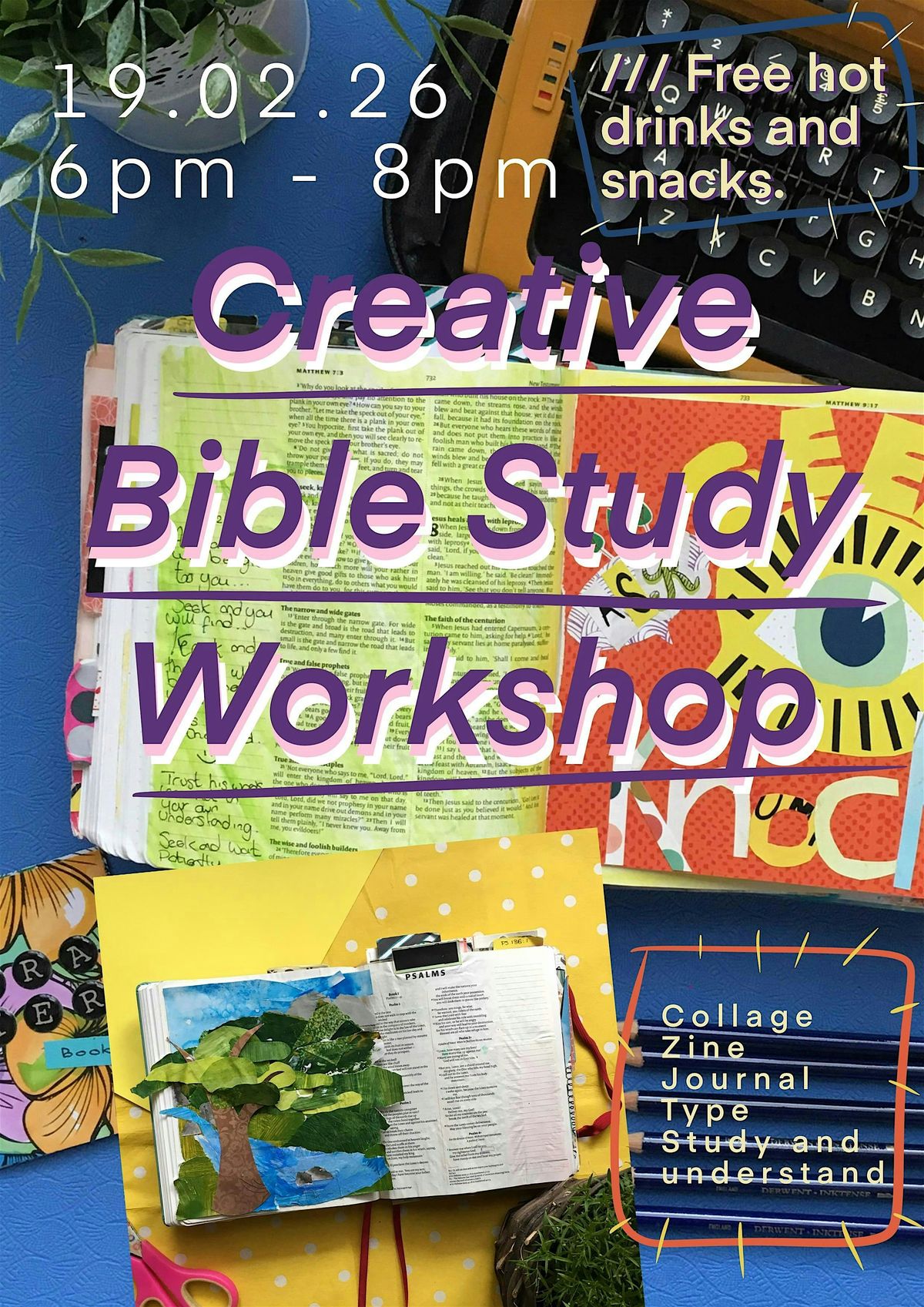 Welcome to the Creative Bible Study Workshop happening at Quayside MediaCityUK. Join us for a fun and interactive session where we dive deep into the teachings of the Bible in a creative way. Whether you're new to studying the Bible or have been doing it for years, this workshop is perfect for everyone. Get ready to explore the scriptures like never before and gain new insights into the Word of God. Don't miss out on this opportunity to grow spiritually and connect with like-minded individuals. See you there!