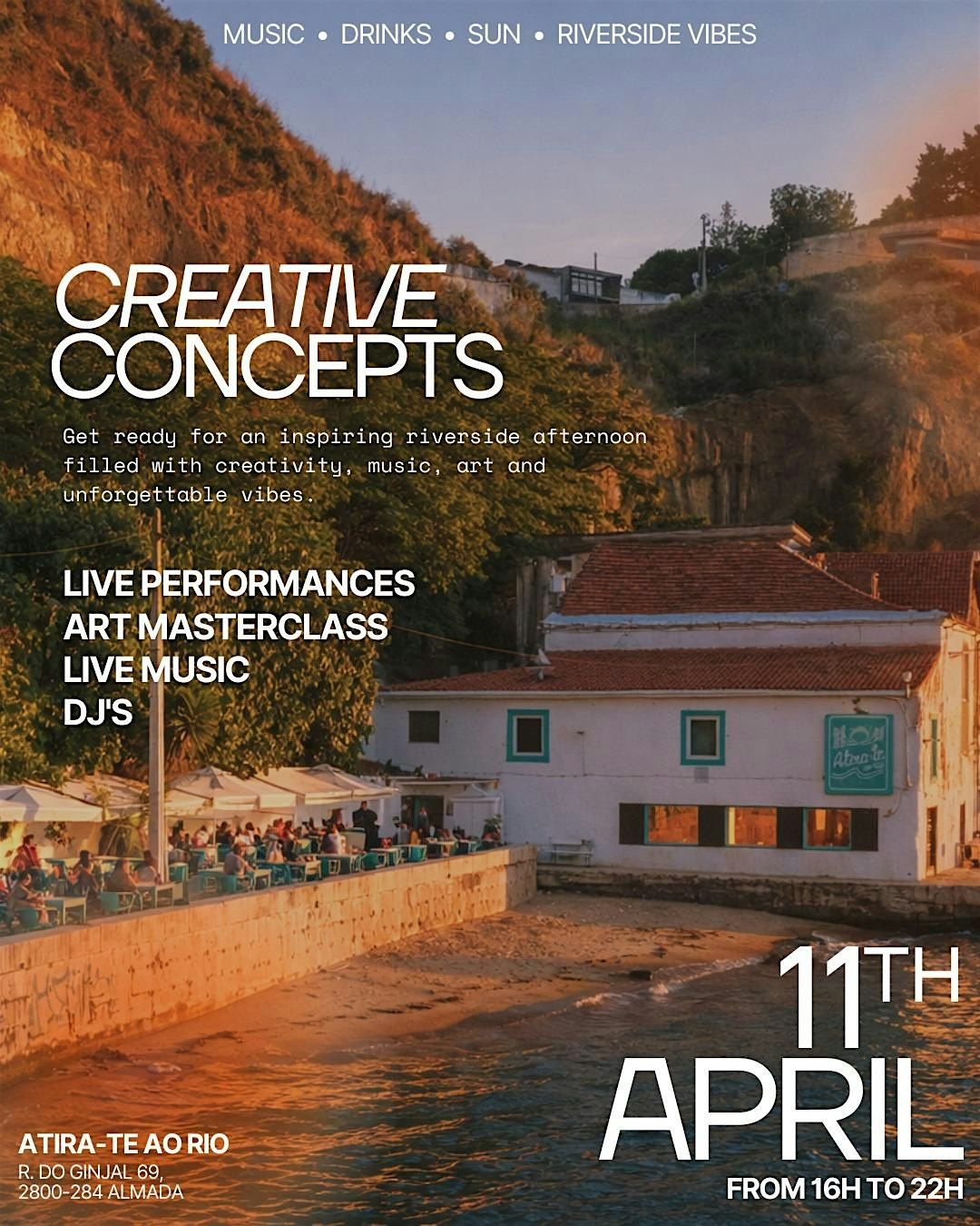 11 de Abril das 16h às 22h.Sunset, música, drinks e vibe à beira-rio.