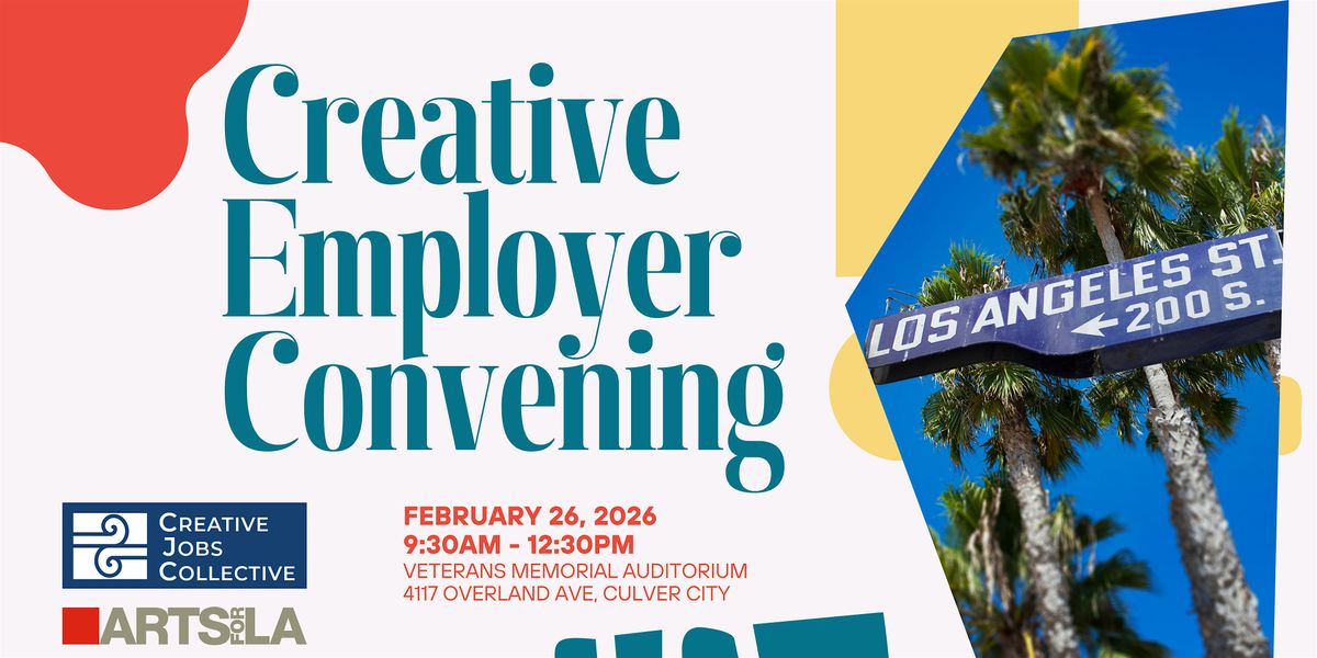 Join us for the Creative Jobs Collective's first ever Creative Employer Convening! The Creative Jobs Collective is an initiative of Arts for LA working towards building 10,000 living wage creative jobs in LA by 2030. We are excited to gather employers to learn more about how they can engage with this effort. The convening will bring together creative sector employer leaders to network, learn about the Creative Jobs Collective and our new Employer Toolkit, as well as engage in conversation about the future of the local creative economy.