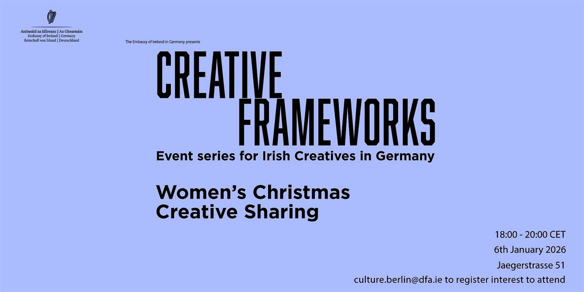 Creative Frameworks is an event series for Irish artists to connect, support, and share, hosted by the Embassy of Ireland in Berlin. This special edition for Women’s Christmas is a get-together for artists to share their creative talents and to network with other women artists based in Berlin. Bring a song, a poem, a page to read or some of your art to show.