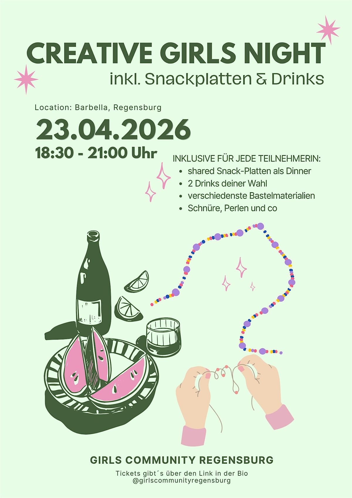 Hey Mädels! 🎨✨ Kommt vorbei zur Creative Night in Regensburg – ein entspannter Abend nur für uns in der Girls Community. Lasst uns zusammen kreativ werden, quatschen und einfach eine tolle Zeit haben. Wir werden mit Perlen basteln, unsere Kreativität ausleben und dabei neue Girls kennenlernen. Das ist dein Vibe? Dann bist du hier genau richtig! Alles in Person, also freut euch auf coole Vibes und echte Begegnungen. Wir sehen uns! <3