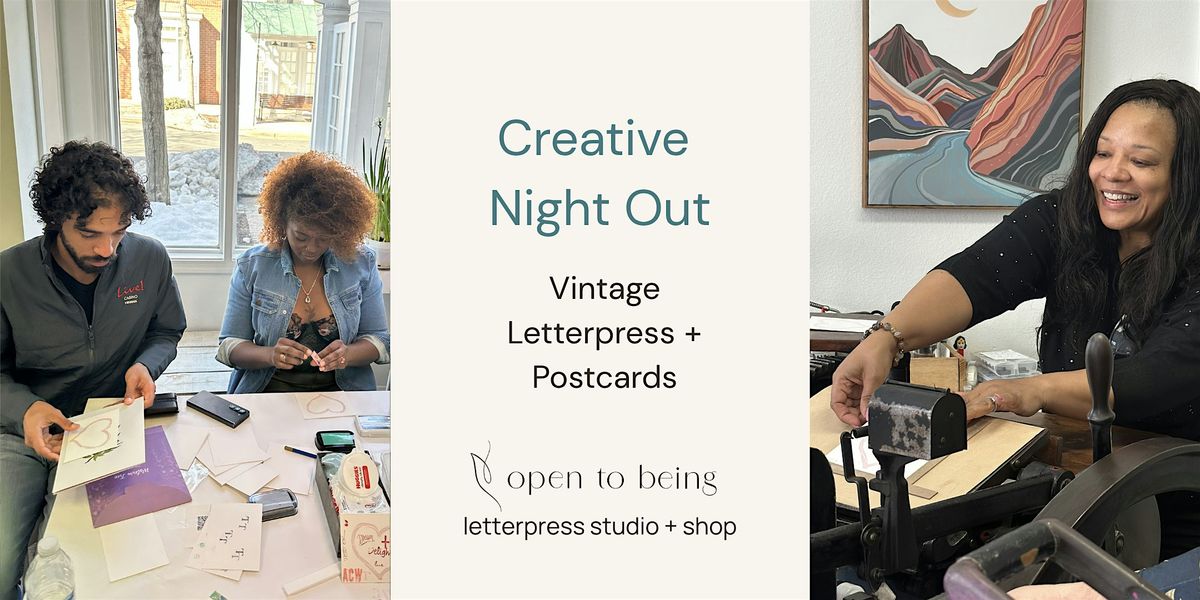 Join us for a Creative Night Out at Open to Being, featuring vintage letterpress printing and postcard writing in our Arlington studio + shop. Celebrate our one-year anniversary with a relaxed, hands-on evening of mindful making and time together.