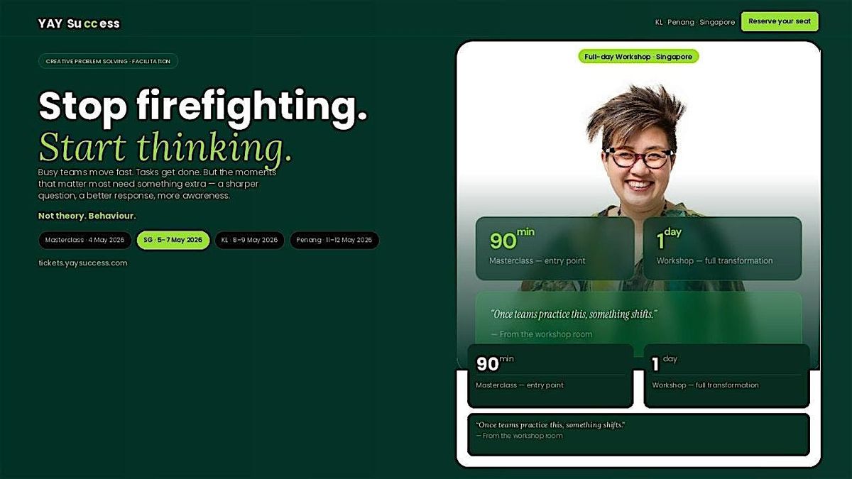 This premium full-day workshop in Singapore is designed to help professionals, leaders, facilitators and teams build practical creative problem-solving skills they can apply immediately.