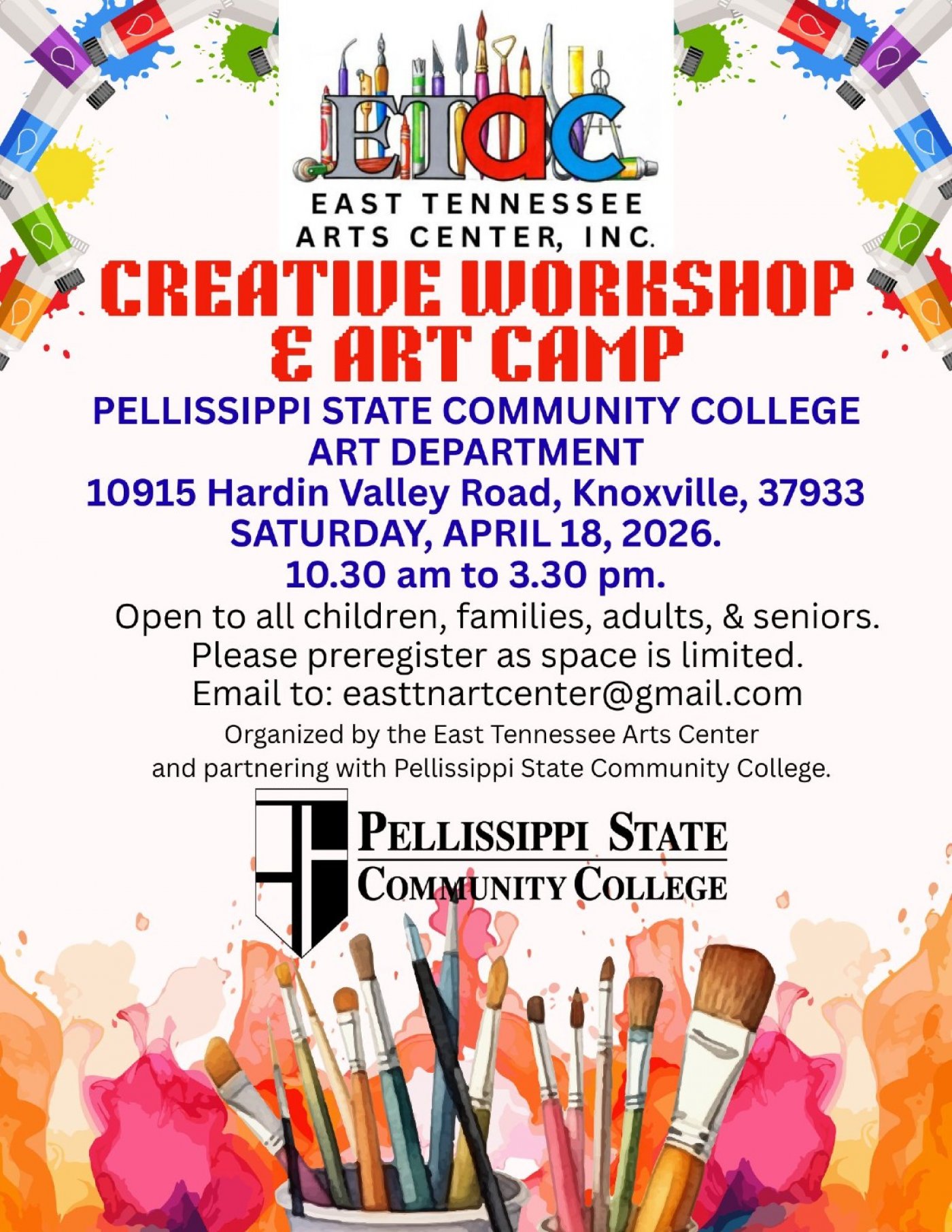 Come enjoy drawing and painting; all ages and skill levels are welcome. All art supplies provided. Preregistration is required to reserve your spot at [email protected]. This is a great opportunity to create art in the Art Department at Pellissippi State Community College.