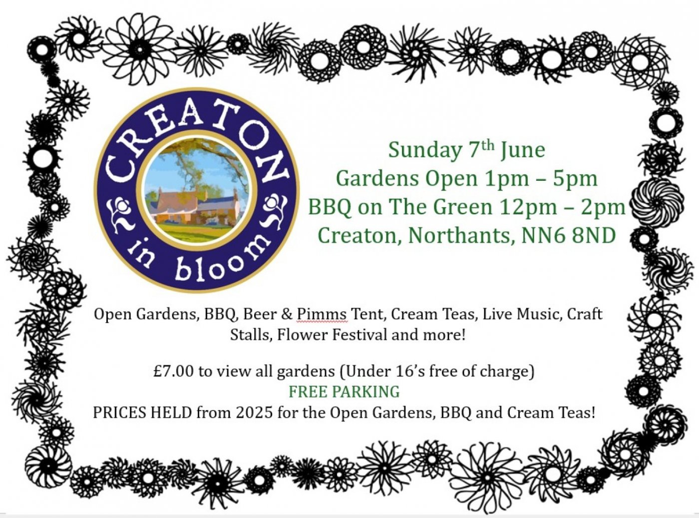 Creaton in Bloom has been running in beautiful rural Northamptonshire for over 20 years and is based around an "open gardens" afternoon, but combines other attractions such as BBQ, craft and market stalls, live music and a classic car display.