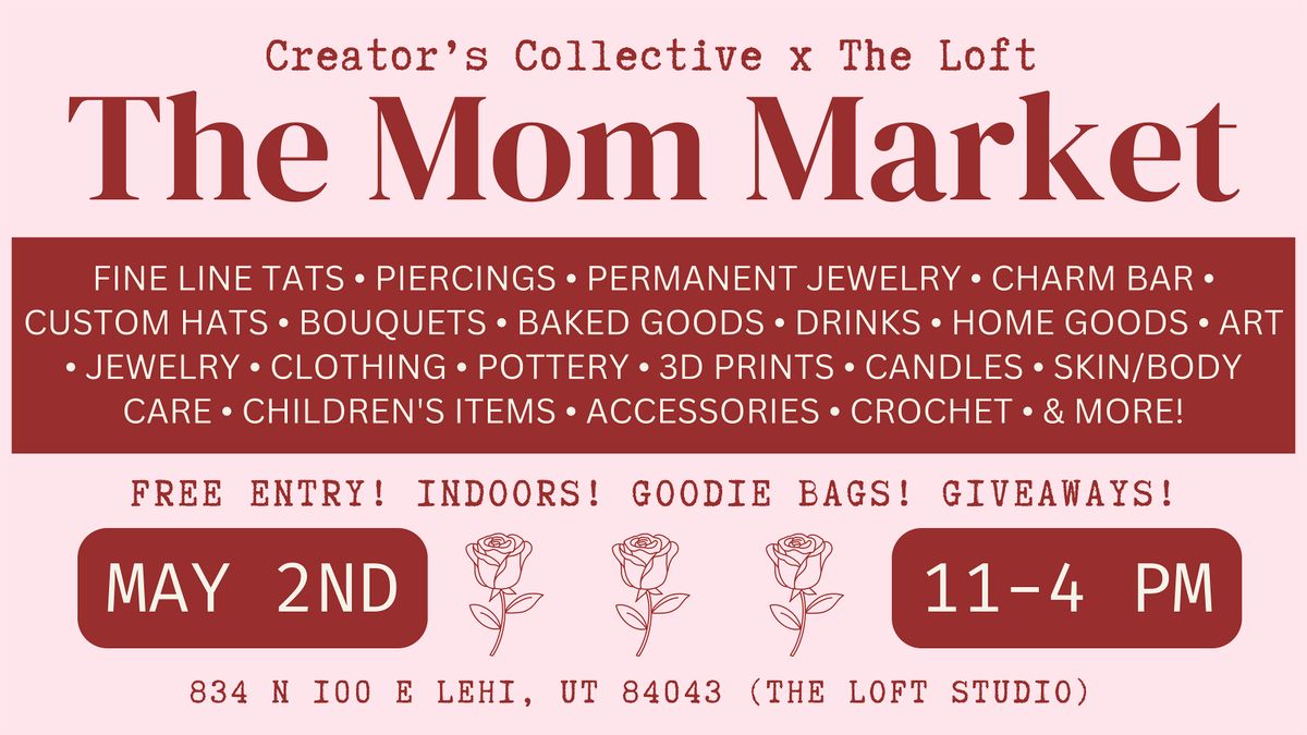 COME AND SHOP THE MOM MARKET IN COLLABORATION WITH THE LOFT STUDIO! Our event is featuring local small businesses, artists, makers, and curators. Join us in celebrating all the amazing moms out there. We are so excited to be partnering with The Loft and hosting this event at their studio!
