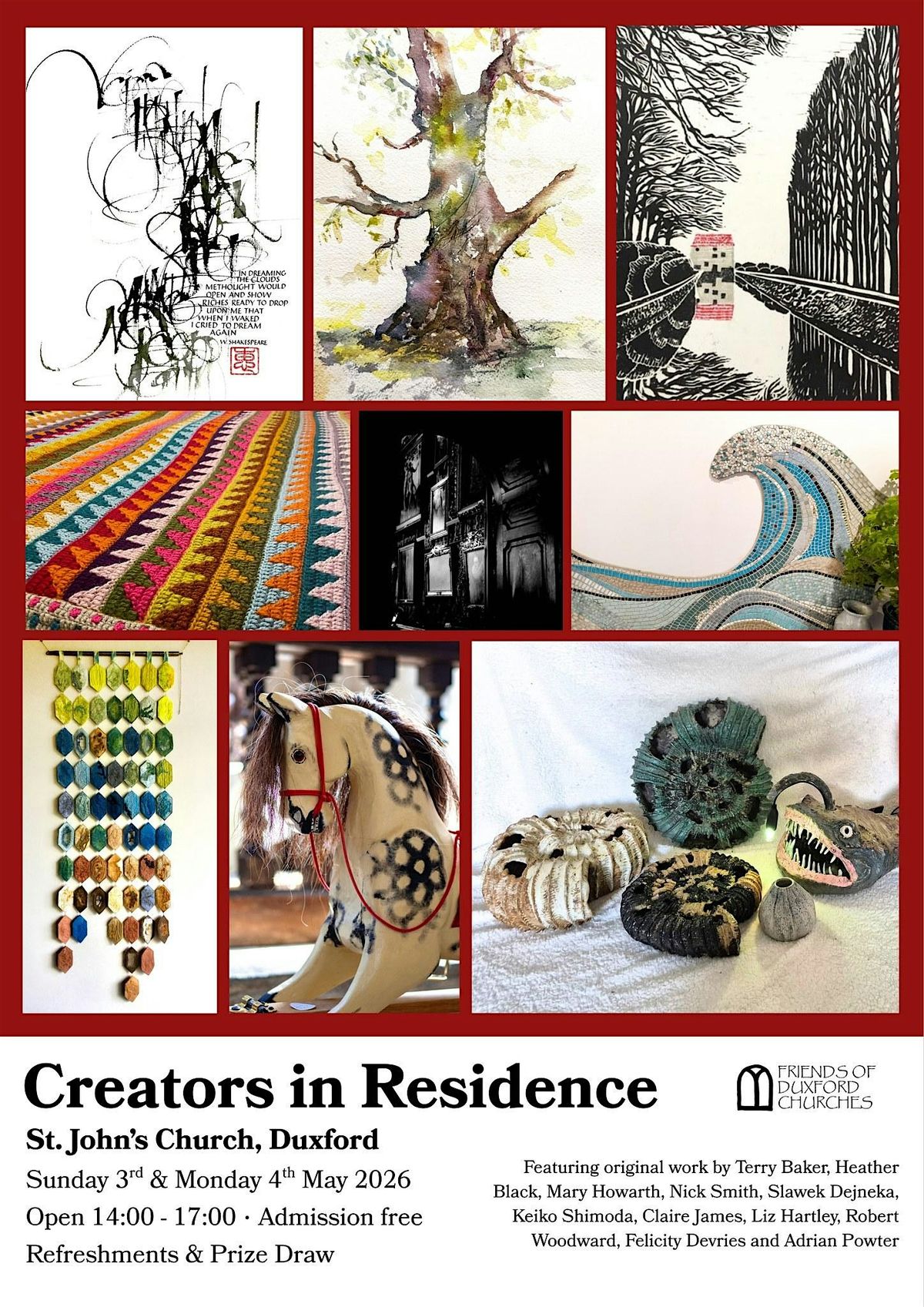 Join us at St John's, Duxford on bank holiday weekend to enjoy a free exhibition of original creations from eleven artists from Duxford and the local area. This is a wonderful opportunity to meet them in person and experience their works up close, all in the beautiful, peaceful surroundings of our Grade I listed medieval church.