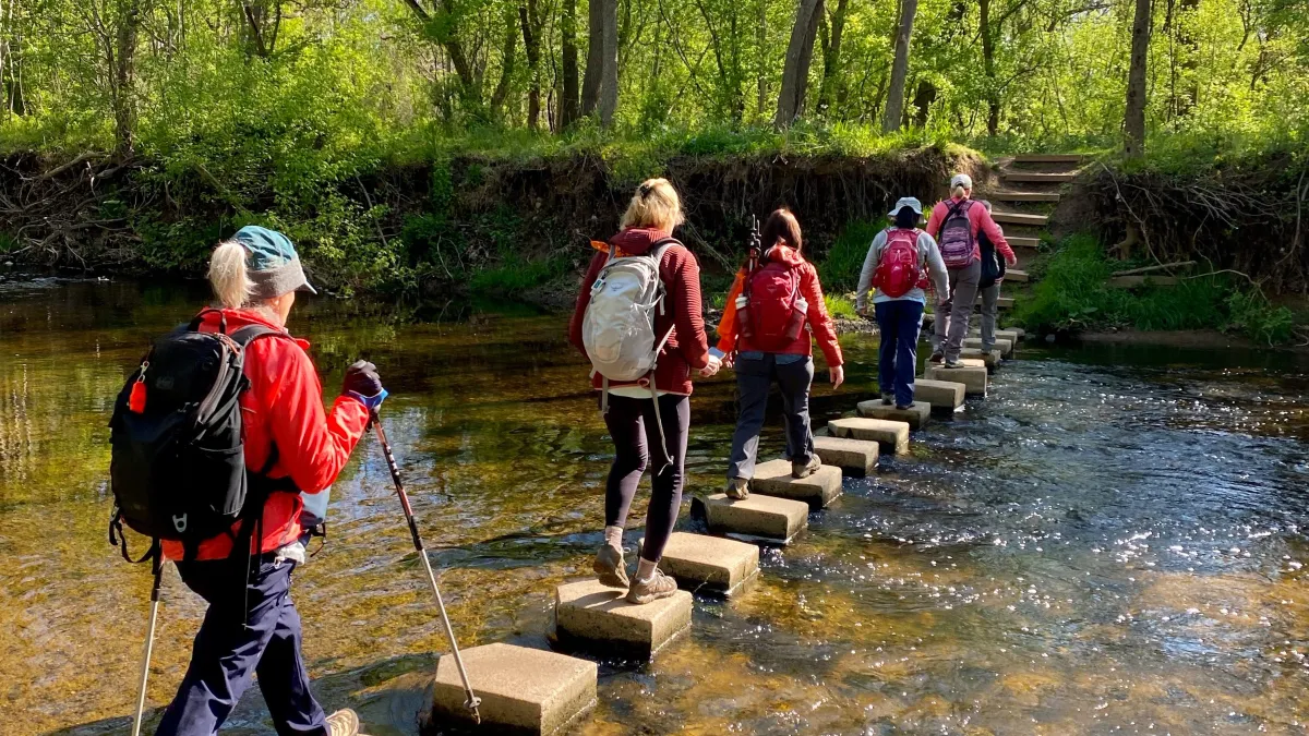 The trail is mostly flat and easily traversed, but there are several crossings and obstacles that you should be prepared for including several creek crossings on spaced rocks, and a ladder (will need to go both up and down, since this is an out and back hike). Be prepared for muddy conditions - waterproof hikers recommended, along with poles if you would like to use them on the crossings or wooded trails. This hike is rated moderate for pace and terrain, but vigorous for distance and obstacles.