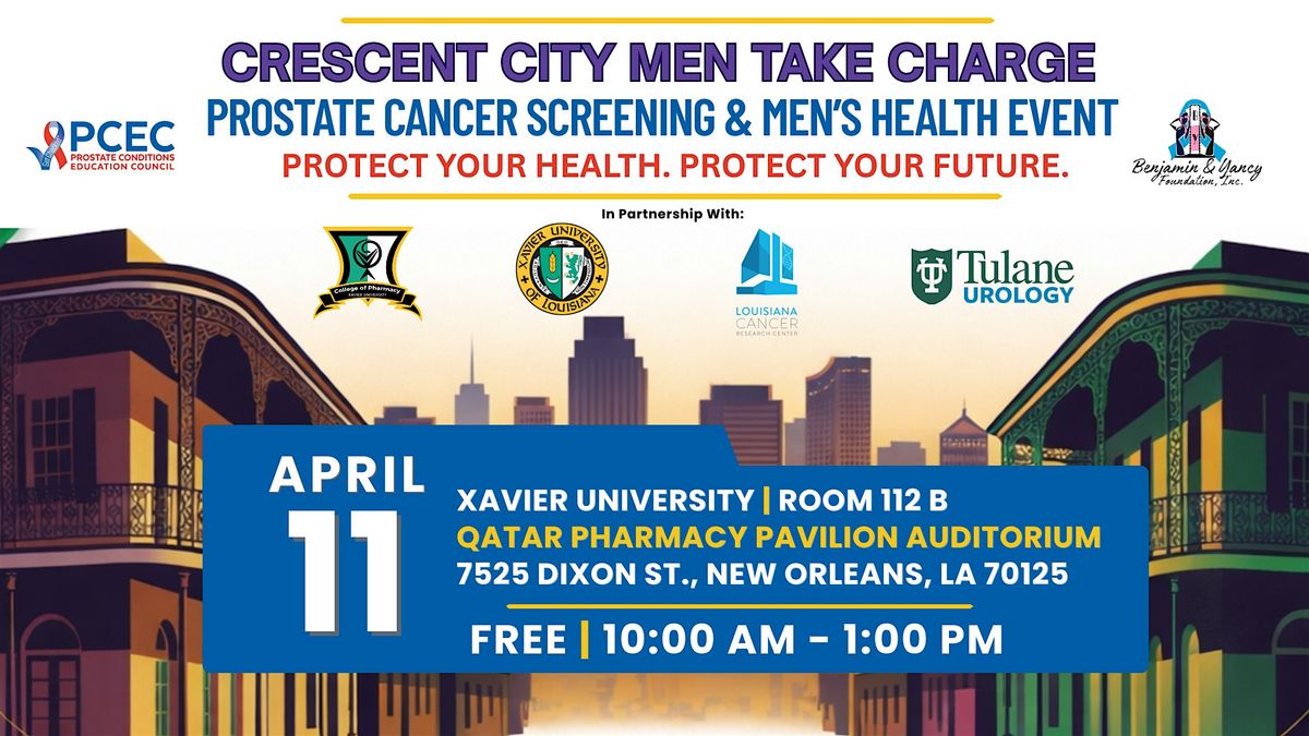 The Prostate Conditions Education Council (PCEC), in partnership with the Benjamin & Yancy Foundation, Inc. (BYF), will host “Crescent City Men Take Charge: Prostate Cancer Screening & Men’s Health Event” on Saturday, April 11, from 10:00 a.m. to 1:00 p.m. at Xavier University of Louisiana, Qatar Ph*rm*cy Pavilion Auditorium (Room 112 B), 7525 Dixon Street, New Orleans, LA 70125.